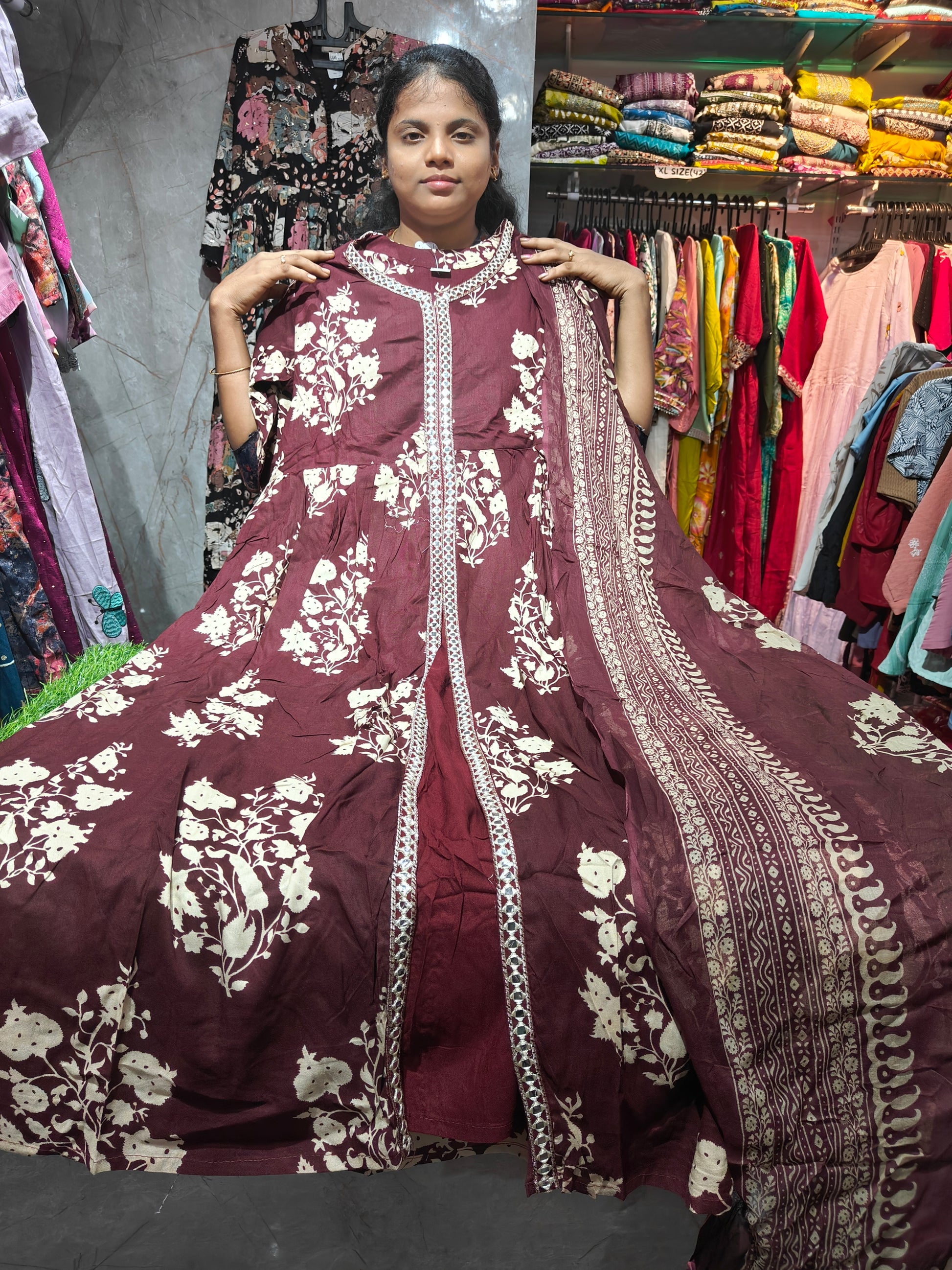 Upgrade your ethnic wardrobe with our Anarkali Top & Shawl Set, made from premium Cotton Rayon fabric for all-day comfort. Perfect for festive wear, office styling, and casual fashion, this elegant outfit blends comfort with grace. The matching shawl adds a stylish finishing touch.