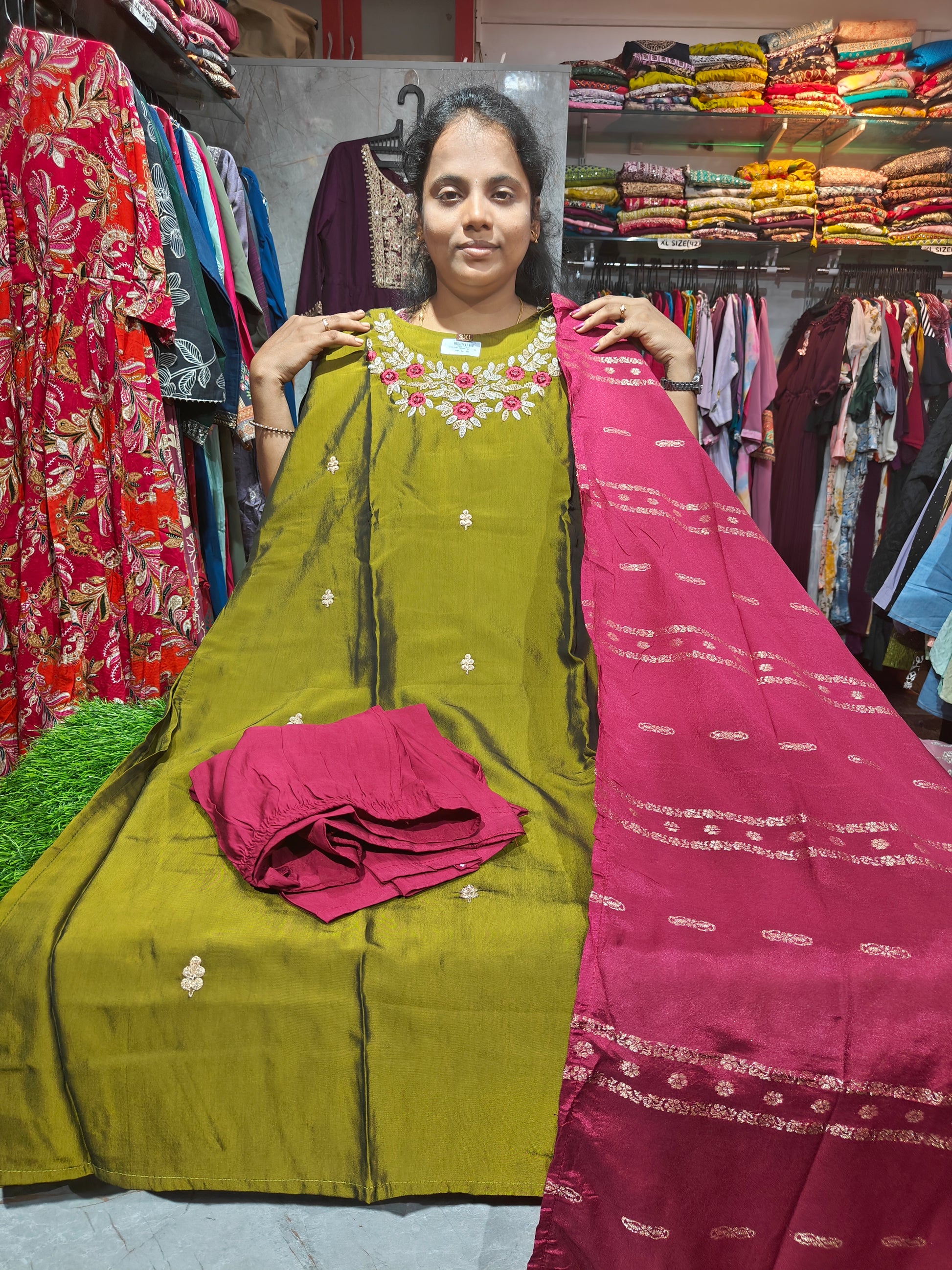 Step into elegance with this Silk Partywear Salwar Set – ESS1199. Made with premium silk fabric, this outfit includes a matching shawl and salwar that add a graceful touch to your festive and party look.