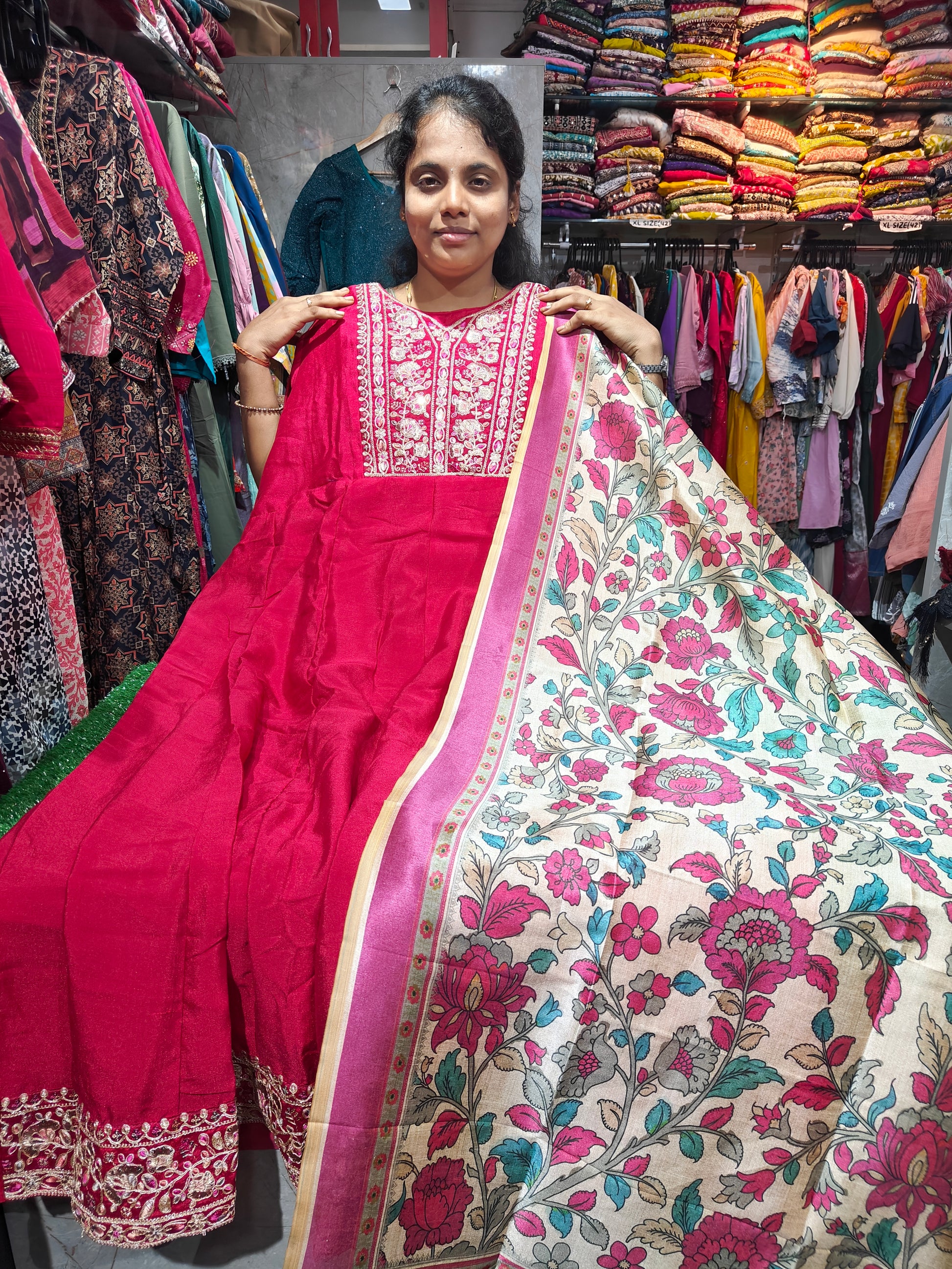 Add elegance to your wardrobe with this premium silk Anarkali kurti PCA799 featuring a stylish panel-cut design. Crafted for plus-size women, this kurti offers a perfect blend of comfort, grace, and festive flair.