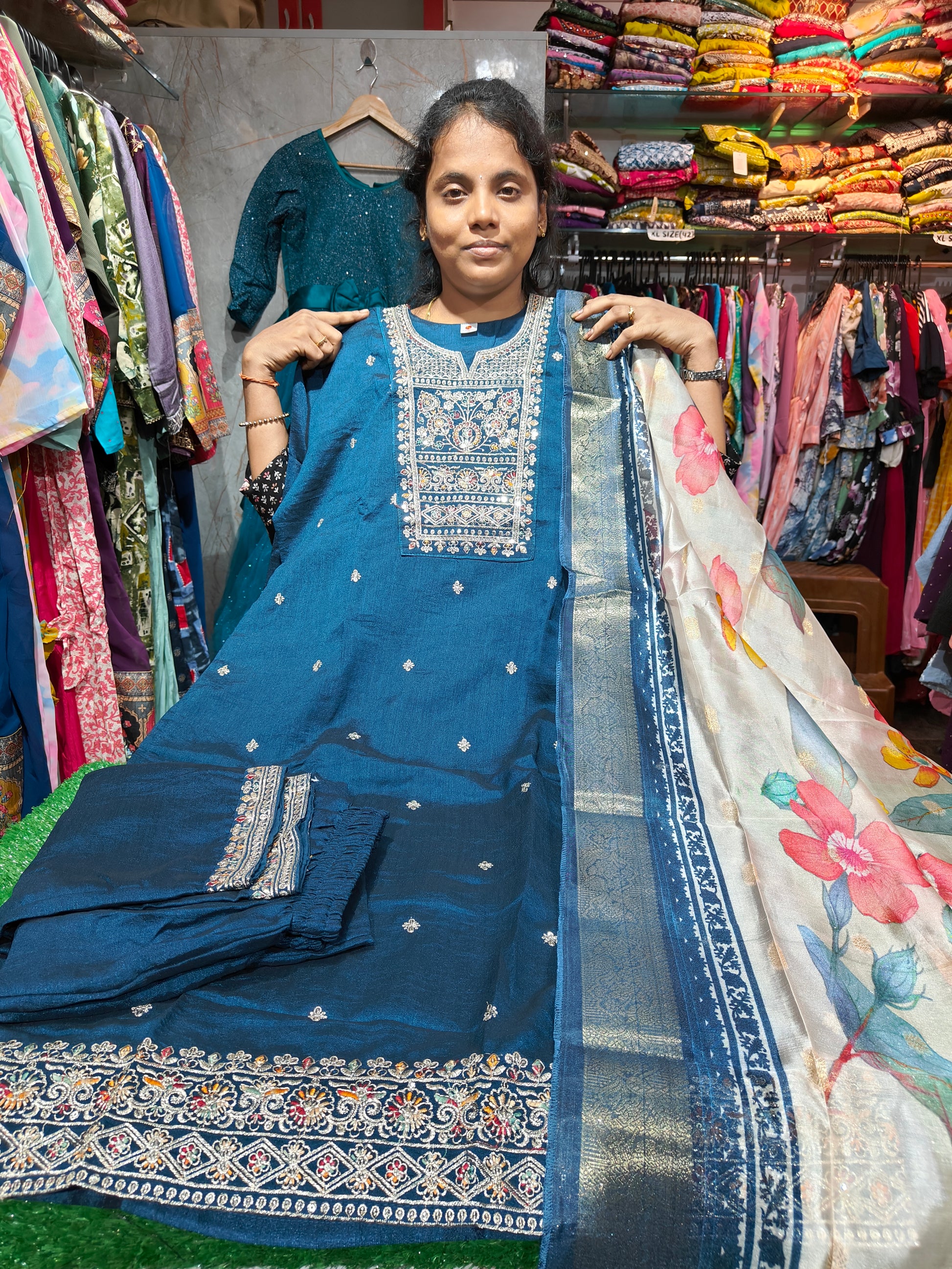 Step into elegance with our Silk Partywear Set featuring a beautifully designed digital print shawl. Perfect for weddings, festive occasions, and special events.